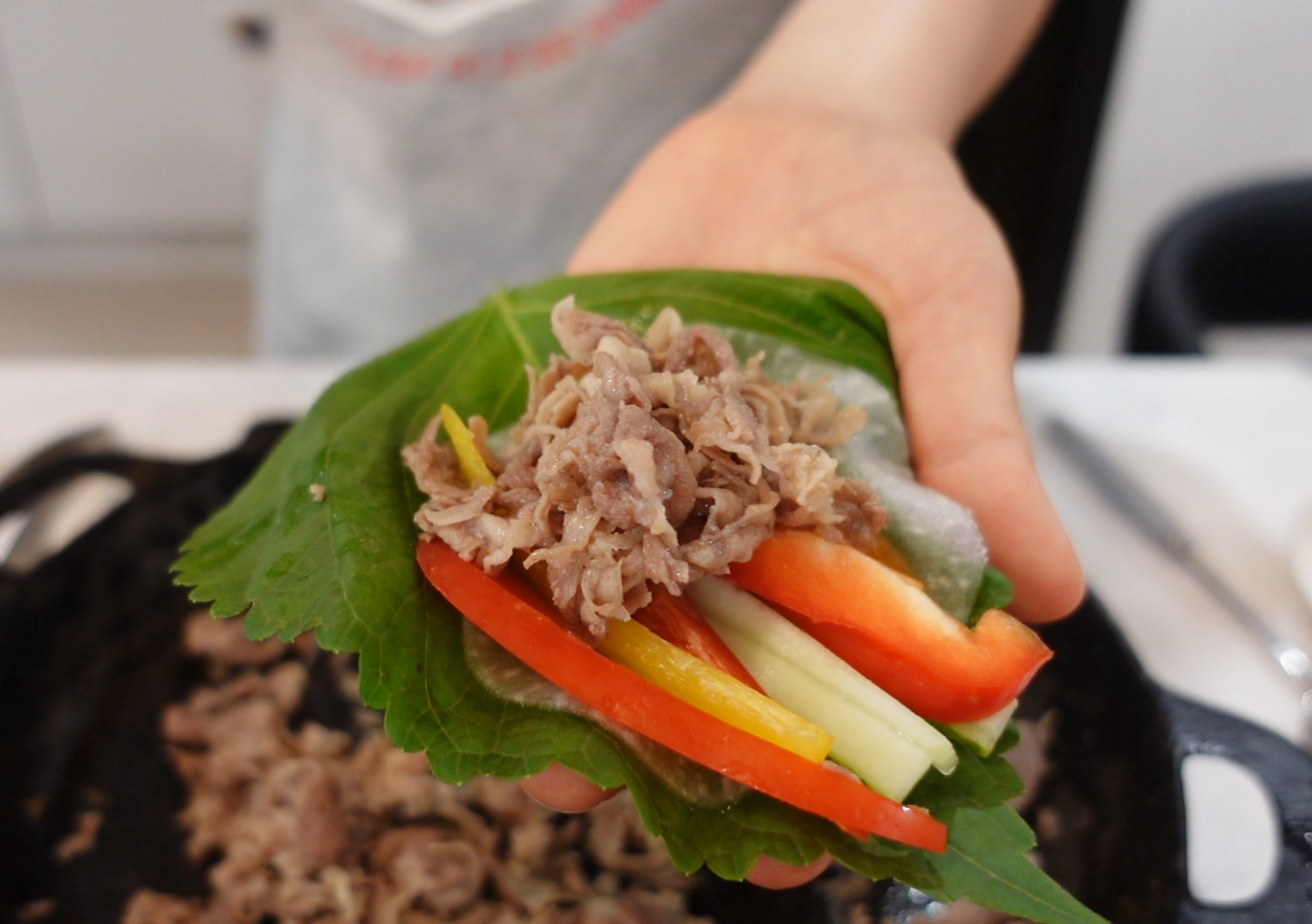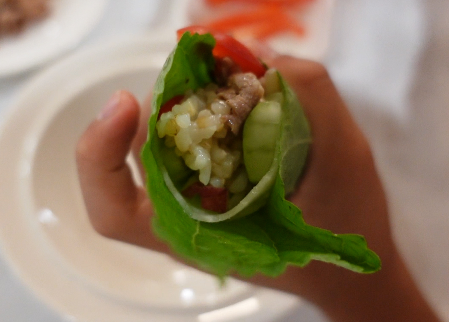첫째는 이렇게 먹으면 맛있다며 쌈에 밥 까지 넣어먹네요.