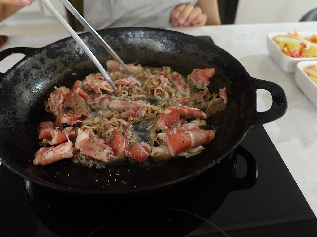 채소와 식기, 준비가 다 되면 이제 고기를 구워줘요.