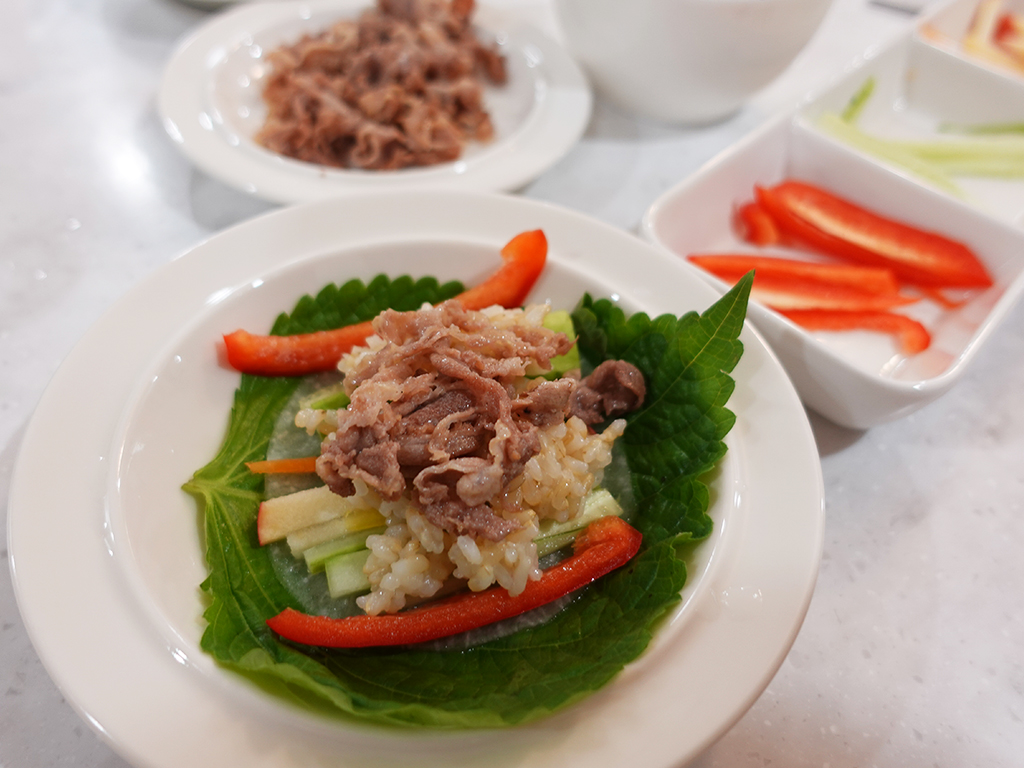 각자 그릇에 야채를 담아주면 알아서 싸먹어요.