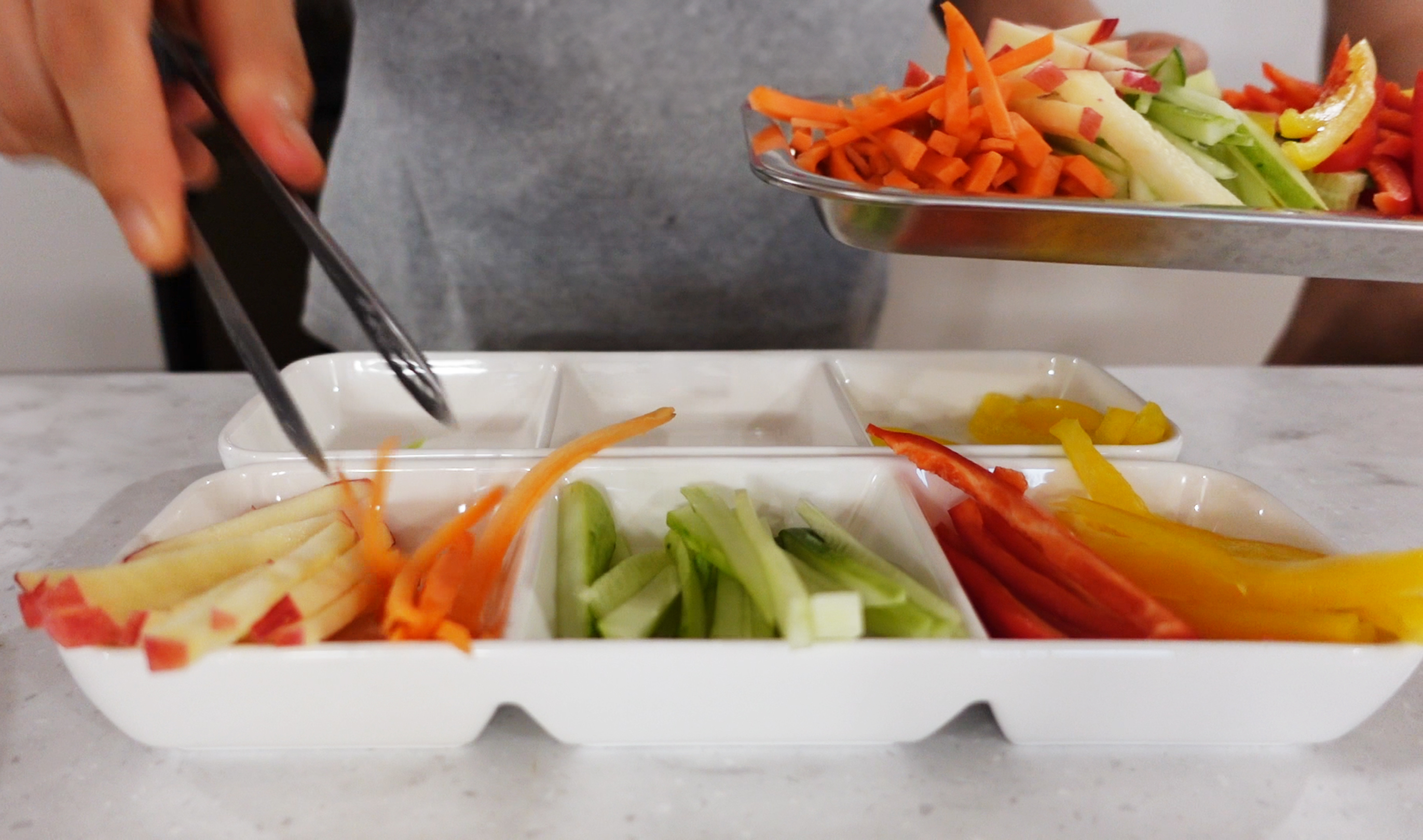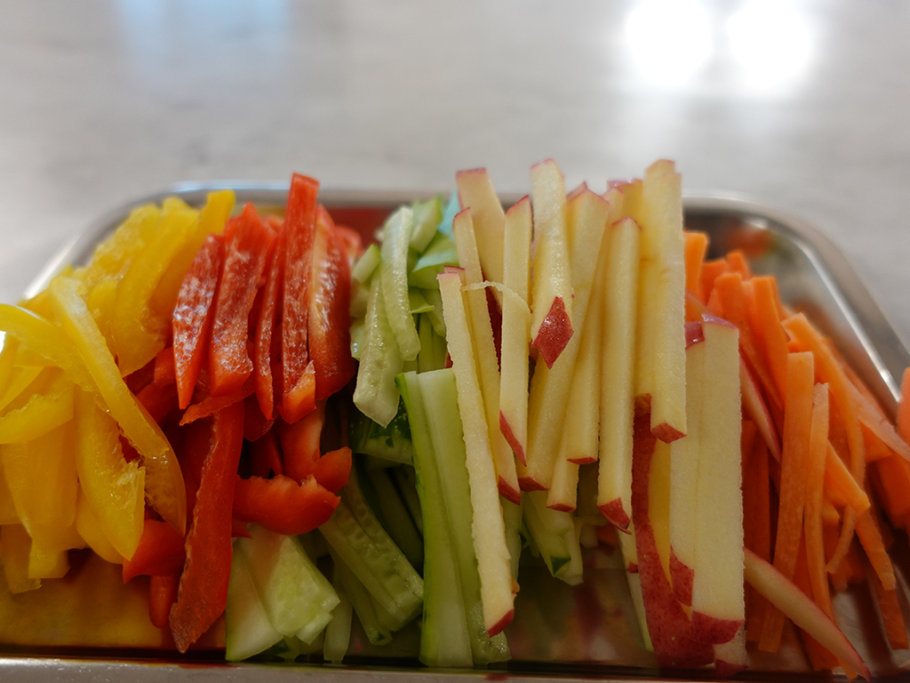 아이들이 먹기 좋게 채소 과일들을 썰어줘요.
