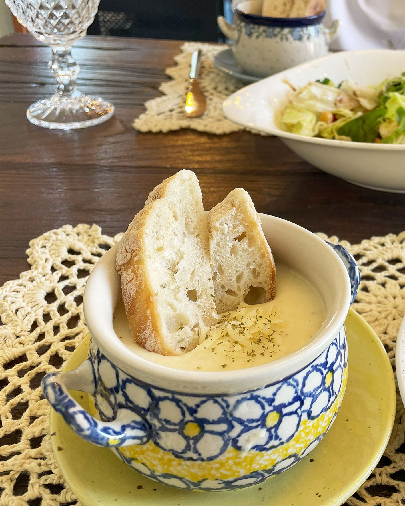 빵에 스프 찍어먹으면 든든한 식사 한 끼로 환상 하모니.