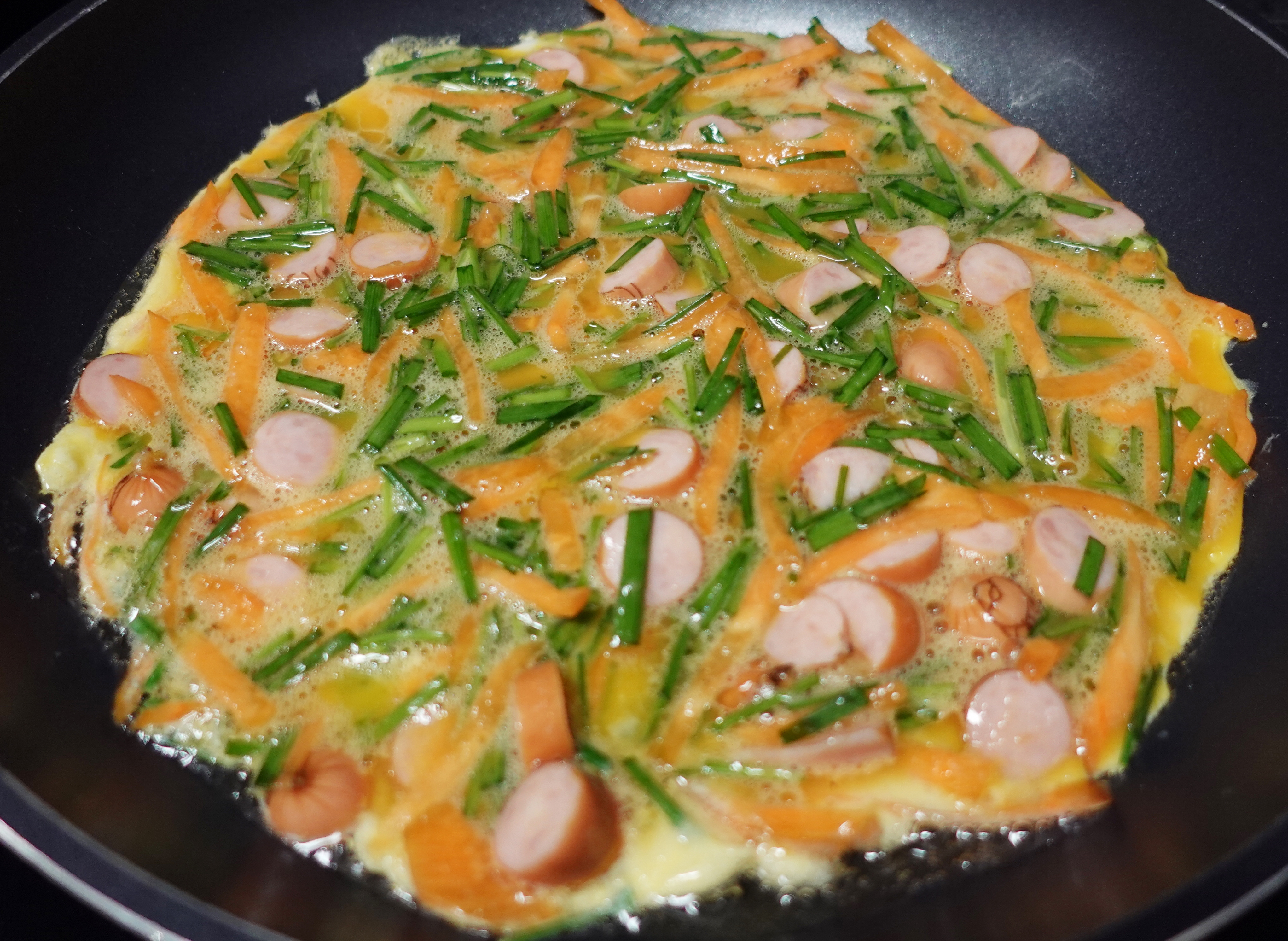 당근 1/4개, 부추 한줌, 소세지 10개, 계란 4개, 소금 약간,