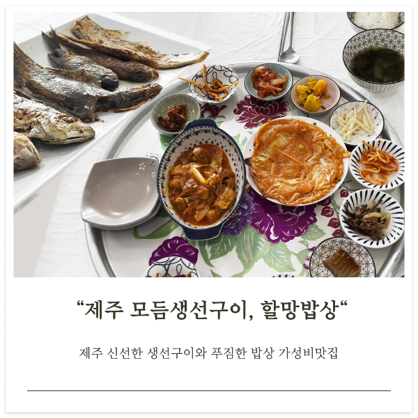 제주산 신선한 생선으로 맛있는 생선구이를 맛볼 수 있고 푸짐한 한 상 차려진 다채로운 음식을 맛볼 수 있는 제주 가성비 맛집을 찾으신다면 할망밥상 들려보세요~