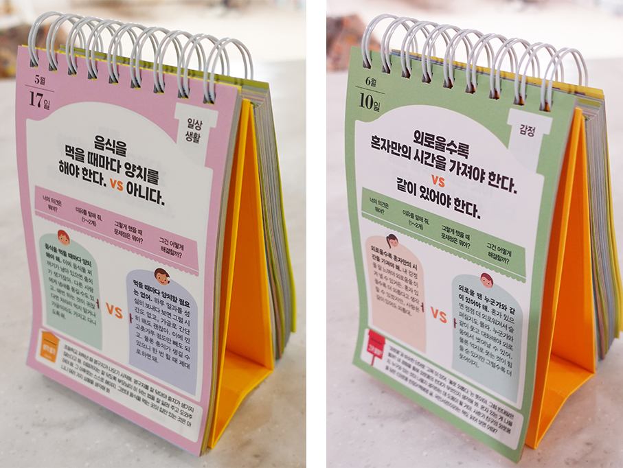 식탁 위에 올려 놓고 한 장씩 넘기면서 주제에 맞게 대화를 나눠요.