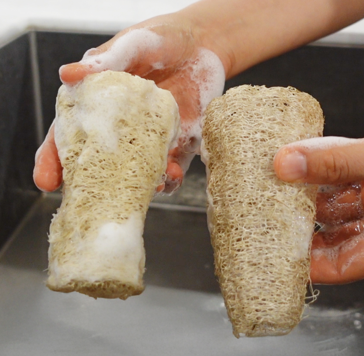 거칠거칠하고 뻣뻣했던 수세미는 물이 닿으면 부드러워지고 비누를 묻히면 거품이 풍부하게 일어나요. 그릇도 부드럽게 잘 닦이고요.