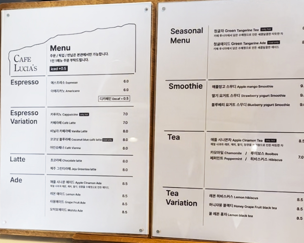 에소프레소, 라떼, 에이드, 시즌 메뉴, 스뮤디, 차 등이 있고