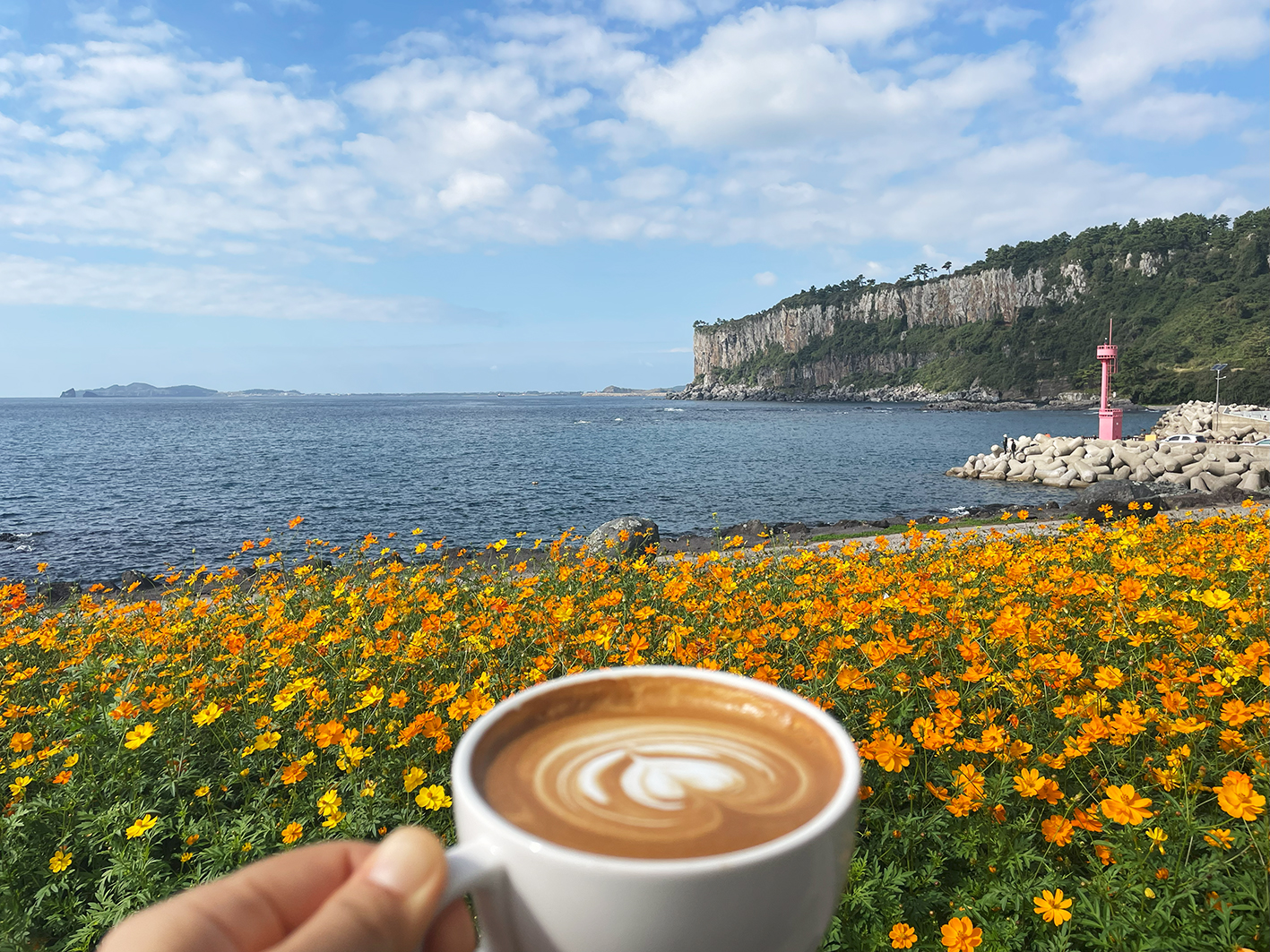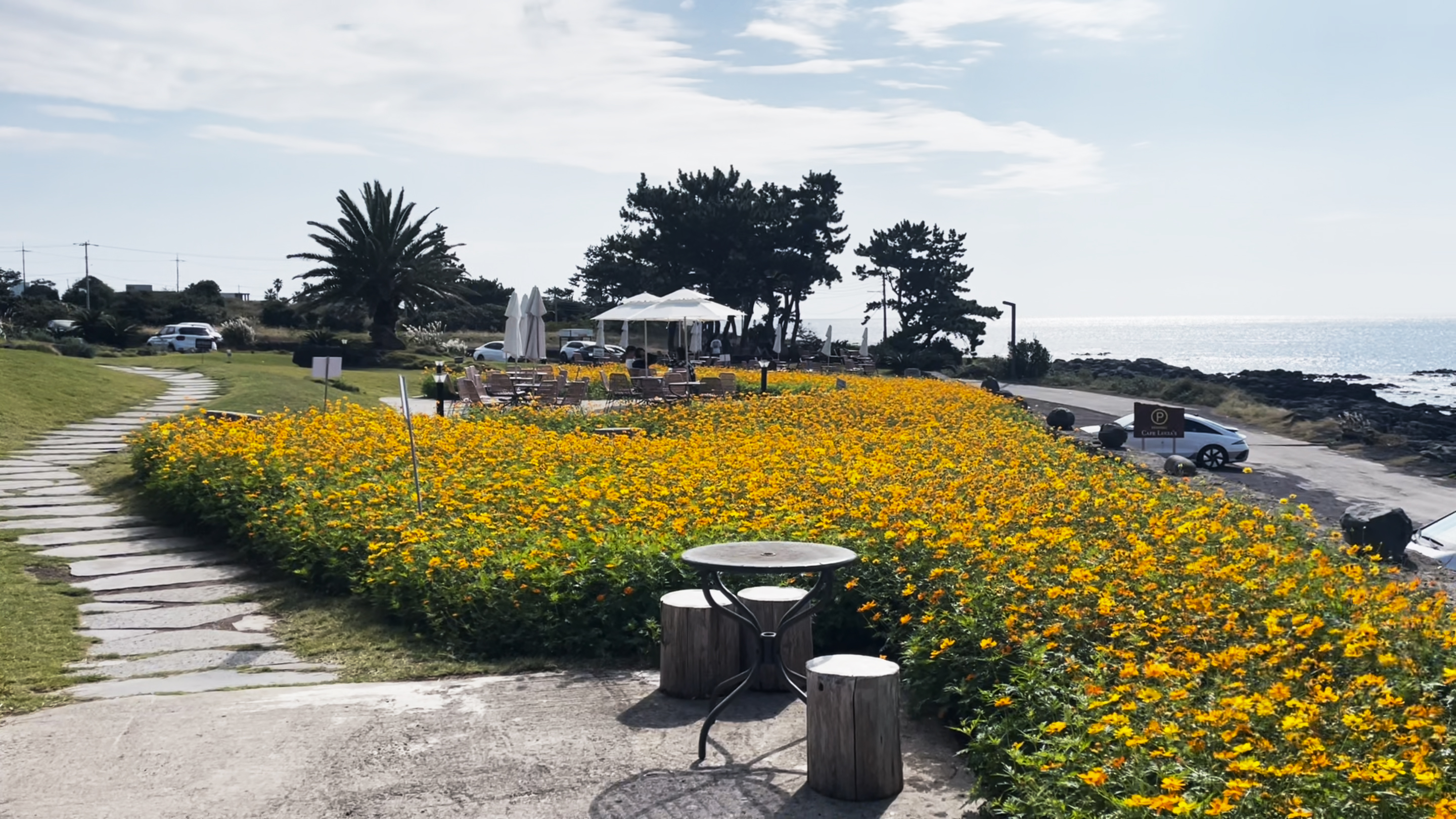 평일 오전이라 바다와 가깝고 꽃들을 원 없이 구경할 수 있는 꽃밭 옆 테이블을 차지하고 가을 제주감성에 젖어들어요.