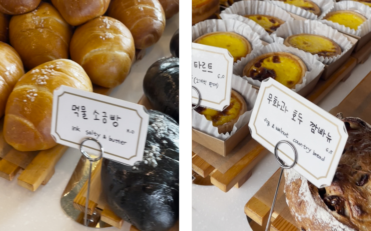 소금빵, 먹물소금빵, 마농빵, 에그타르트, 케익 등 종류가 다양하게 준비되어 있어요.