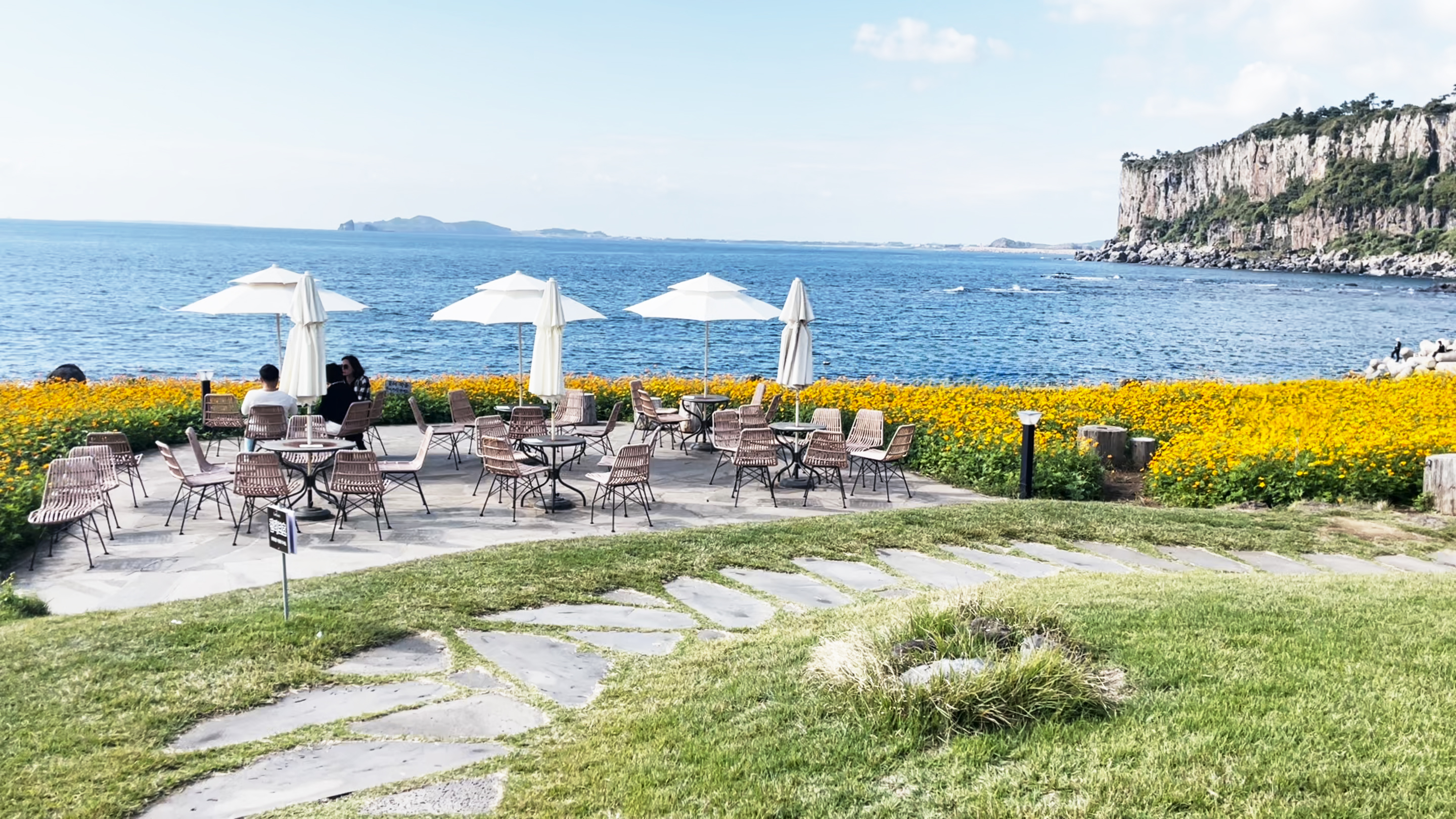탁트인 바다와 박수기정이 보이는 제주 대평리카페