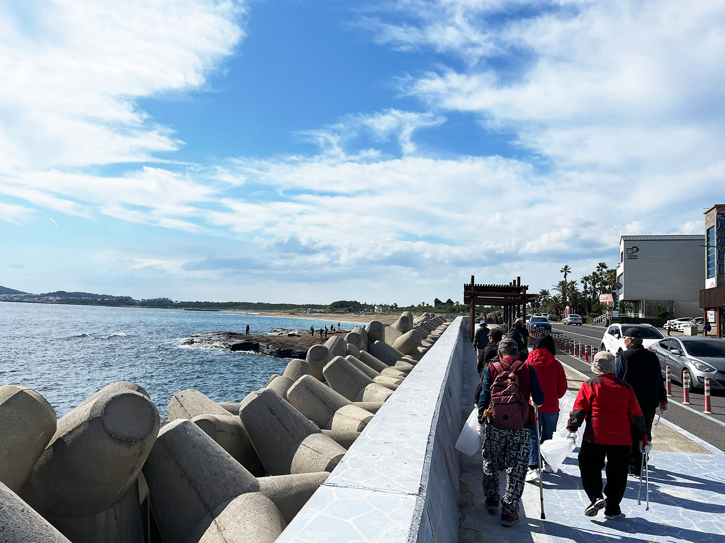 두 번째 활동은 제주 서귀포 사계해변을 돌면 바다 쓰레기를 줍는 플로깅 봉사활동을 진행했어요. '서귀포장애인복지관 서부분관'에서 준비한 장갑, 집게, 쓰레기봉지를 들고 해안가를 돌며 누군가 버렸을 쓰레기들을 주우며 걸었어요.