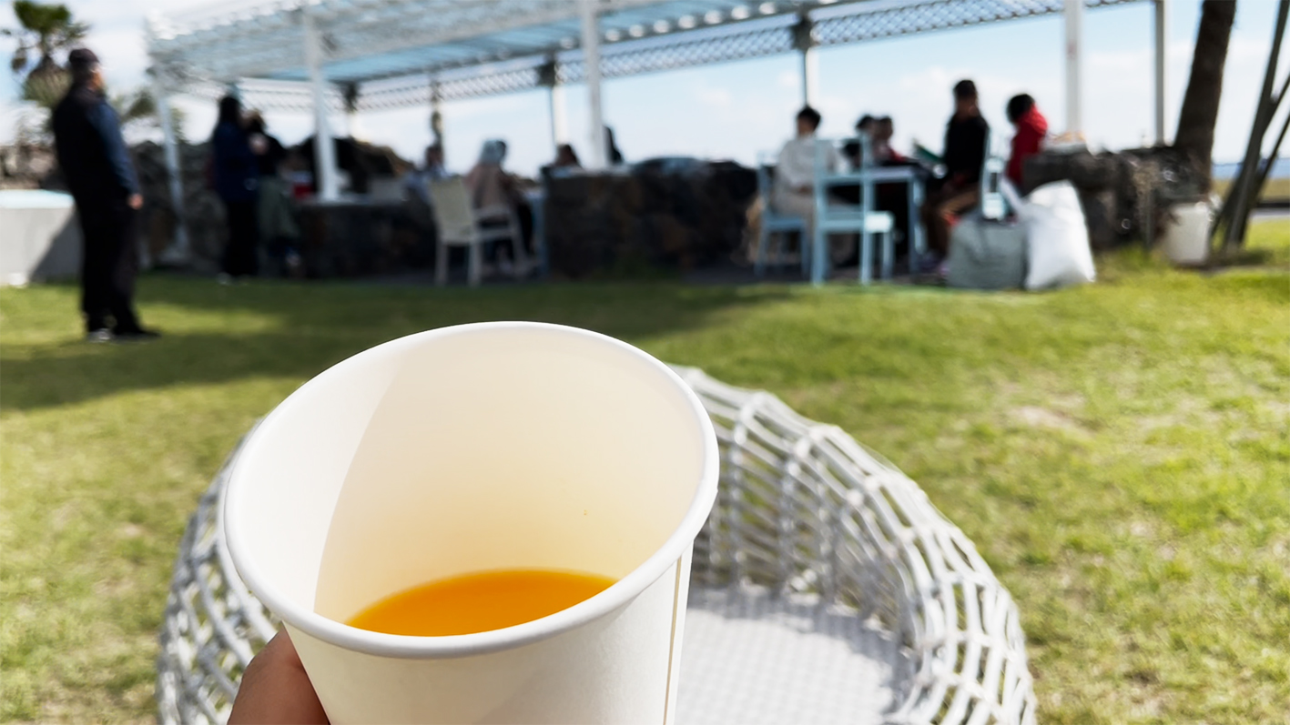 '썬앤문 리조트' 사장님께서 장애인 행사를 한다는 소식을 들으시고 맛있는 원두 커피와 유기농 감귤 착츱 주스를 주셨어요. 환한 얼굴로 어찌나 반갑게 맞아주시는지... 유기농 감귤 쥬스 먹으며 비타민 충전하고 그림 같은 풍경에 단체 사진, 개인 사진도 신나게 찍어봤어요.