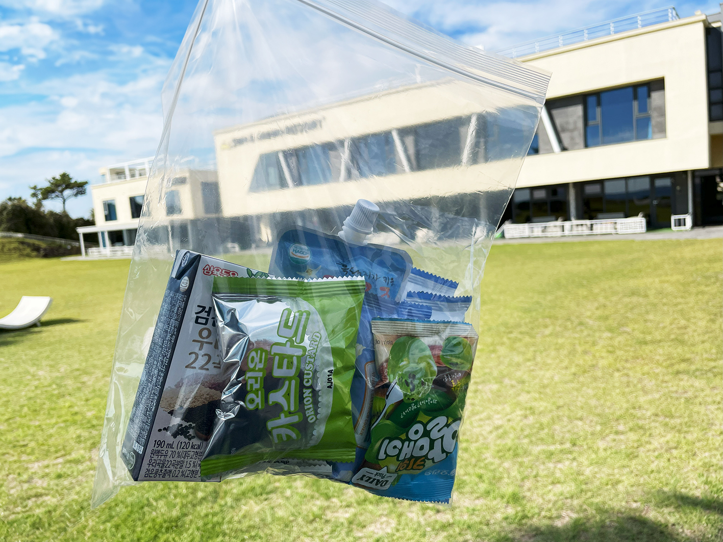 제주 바다를 지키기 위한 의미 있는 쓰레기 줍기를 했고 넓고 예쁜 정원이 있는 '썬앤문리조트' 사장님의 지원으로 간식 타임을 가졌어요.
