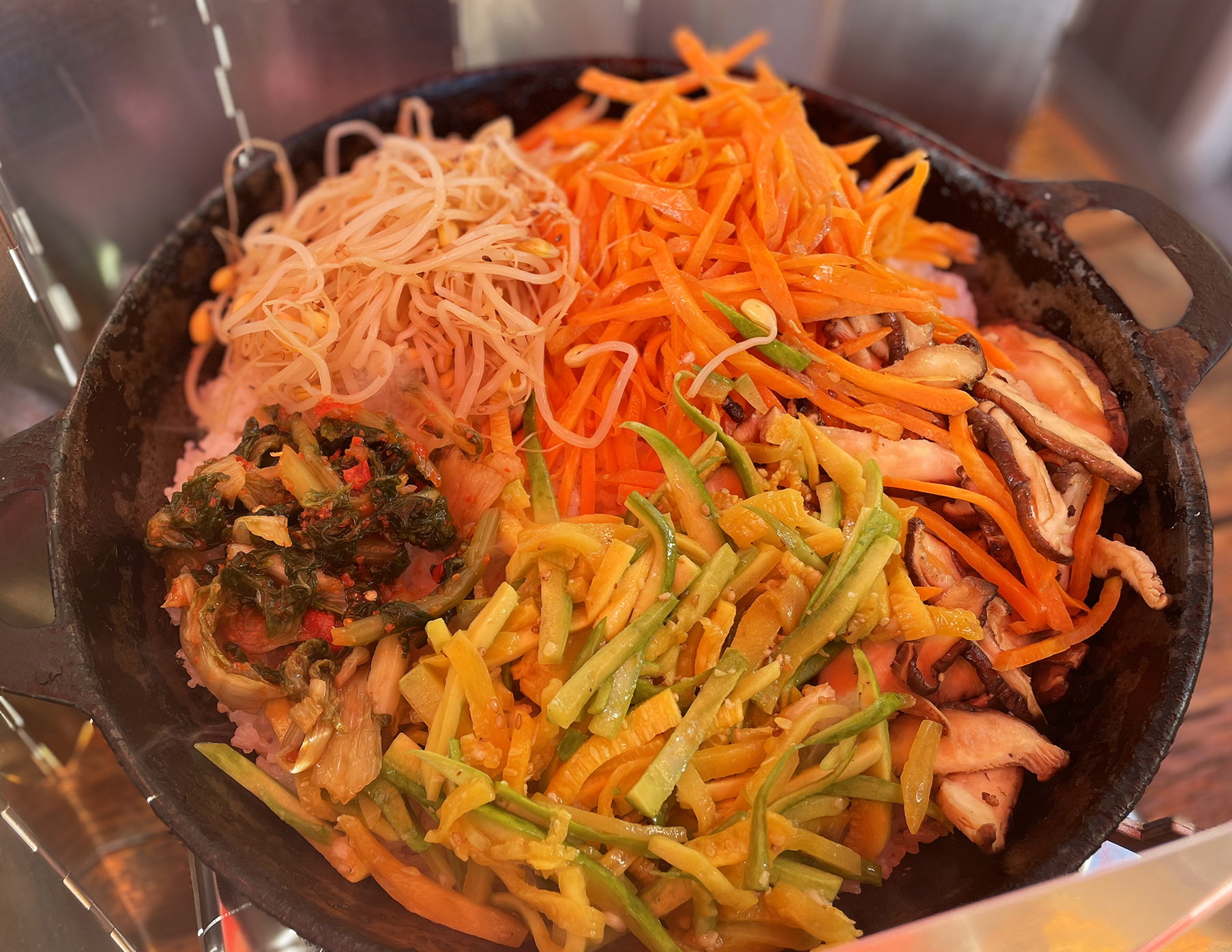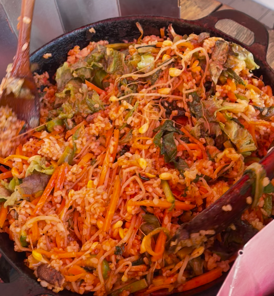 탁탁 지글 지글 소리를 내며 누룽지 냄새가 고소하게 나기 시작하면 준비한 콩나물, 당근채볶음, 표고버섯볶음, 애호박볶음 올려줘요. 열무김치, 고추장 한 스푼을 넉넉하게 넣어주고요.