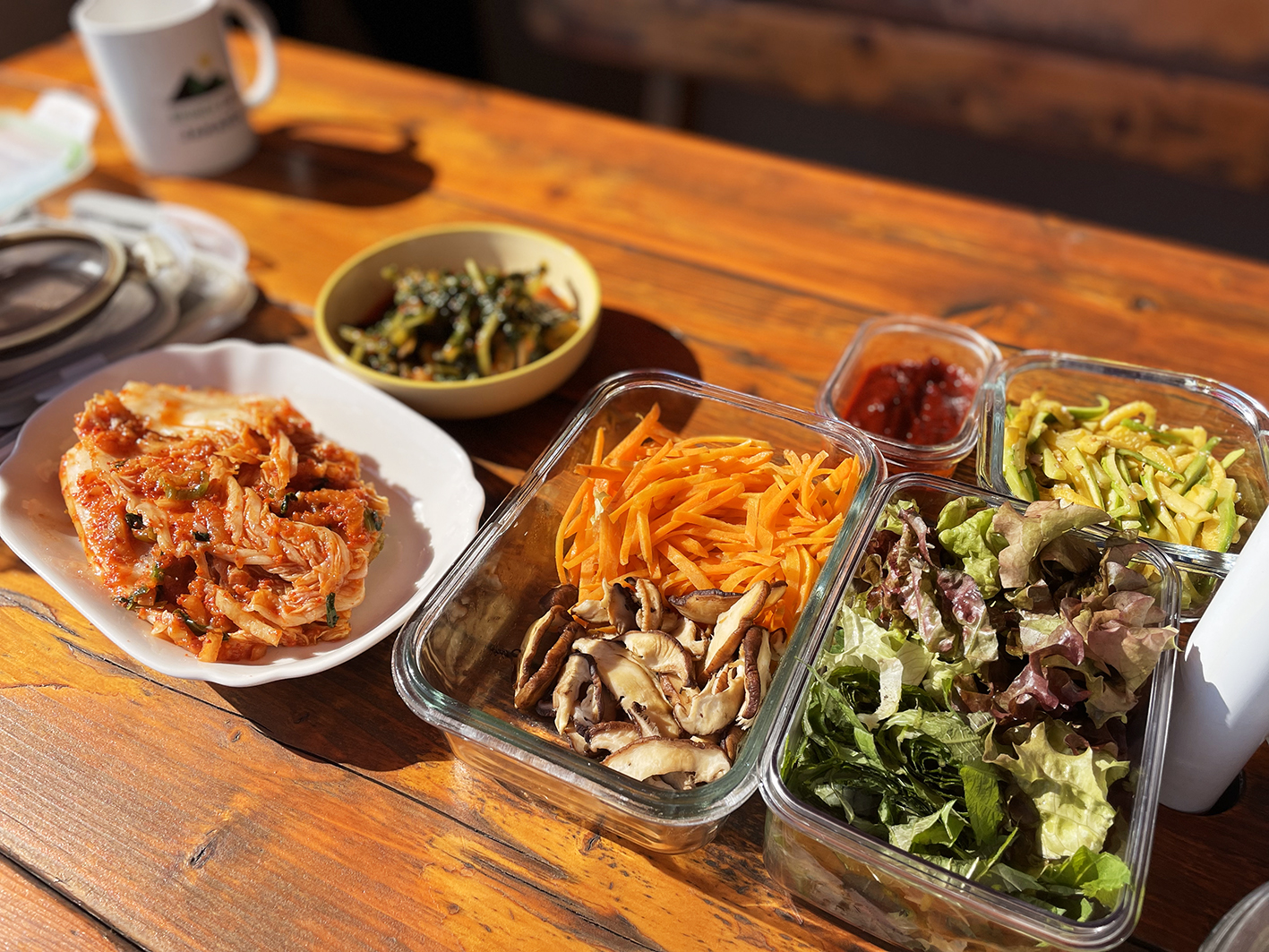 ● 재료 : 밥 4주걱, 콩나물나물, 당근채볶음, 애호박볶음, 표고버섯볶음, 열무김치, 상추 5장, 깻잎 5장, 고추장, 계란 프라이 4