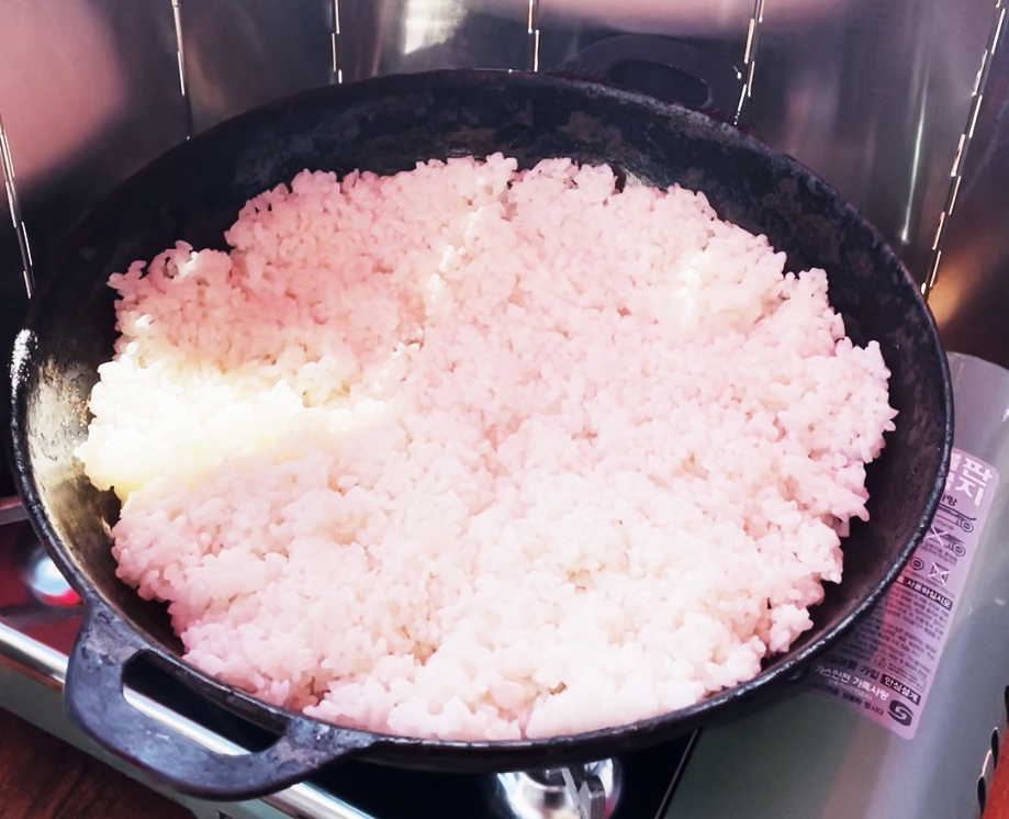 일단 참기름을 달궈진 팬에 붓고 위에 밥을 올려 고소한 누룽지 냄새가 날 때까지 기다려줘요.