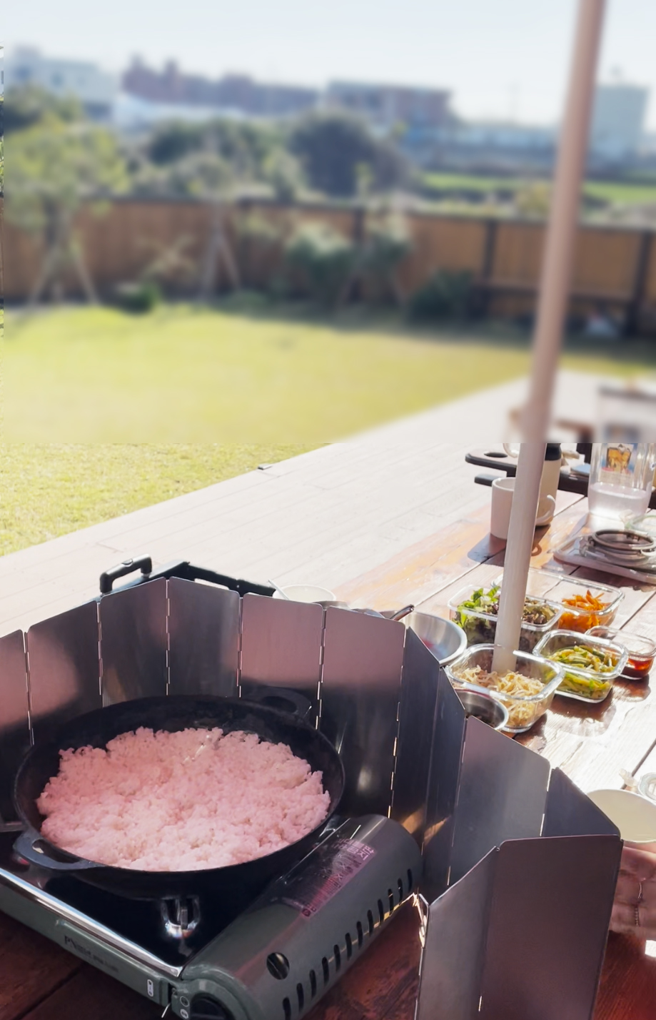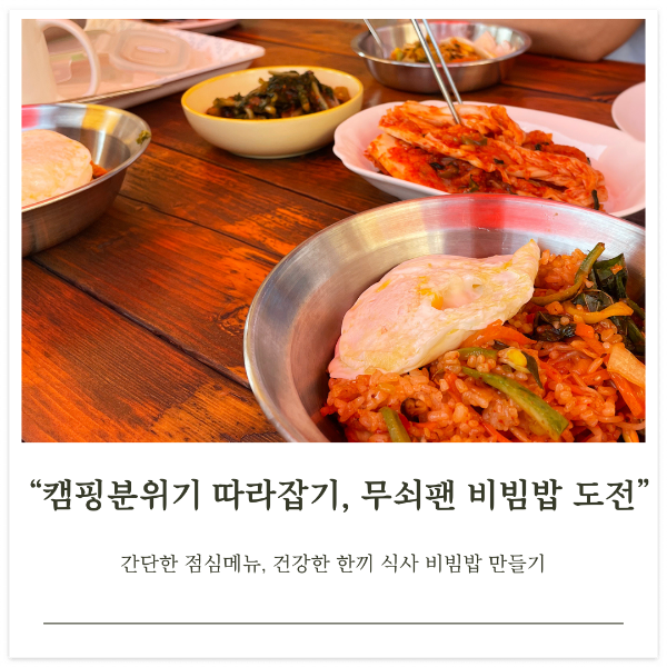 캠핑 분위기 내면서 재료 준비가 간단하고, 부담 없는 한 끼였으면 좋겠다는 조건에 맞았던 메뉴가 비빔밥이었어요. 음식을 미리 준비해 두면 식는다는 거였는데 무쇠팬에 올리면 뜨끈하게 먹을 수 있겠다 싶더라고요.