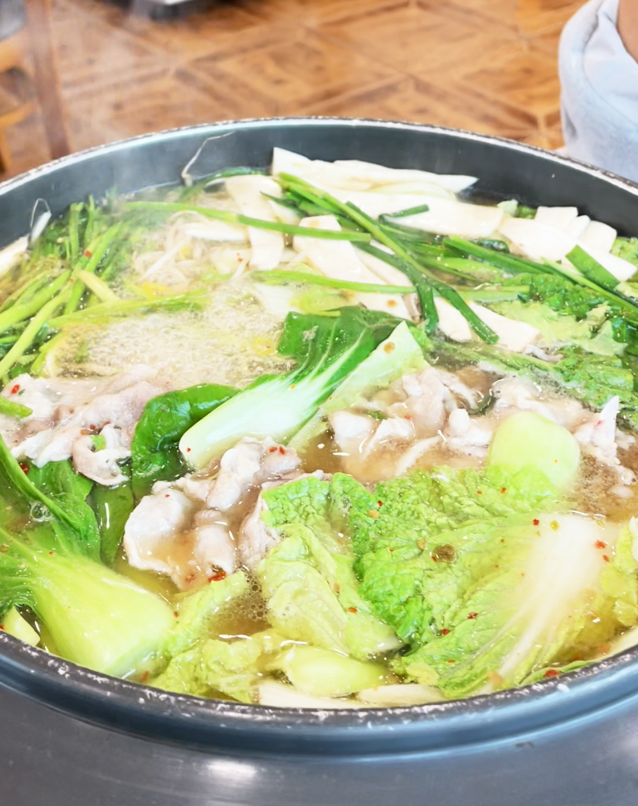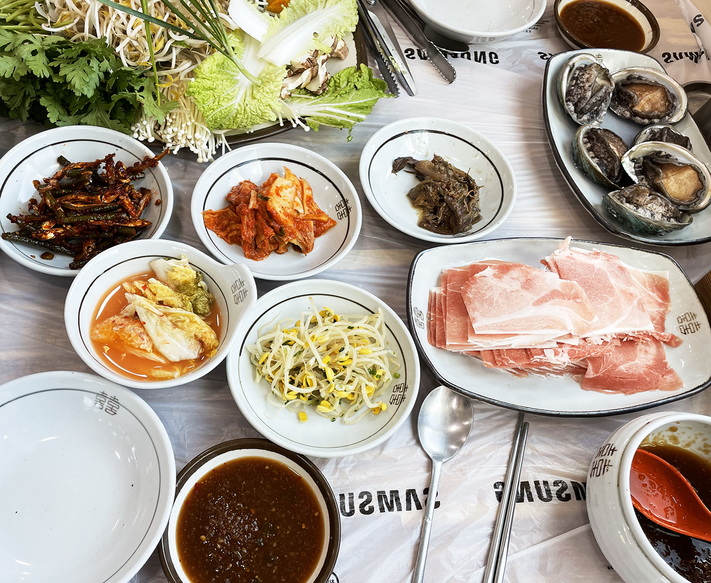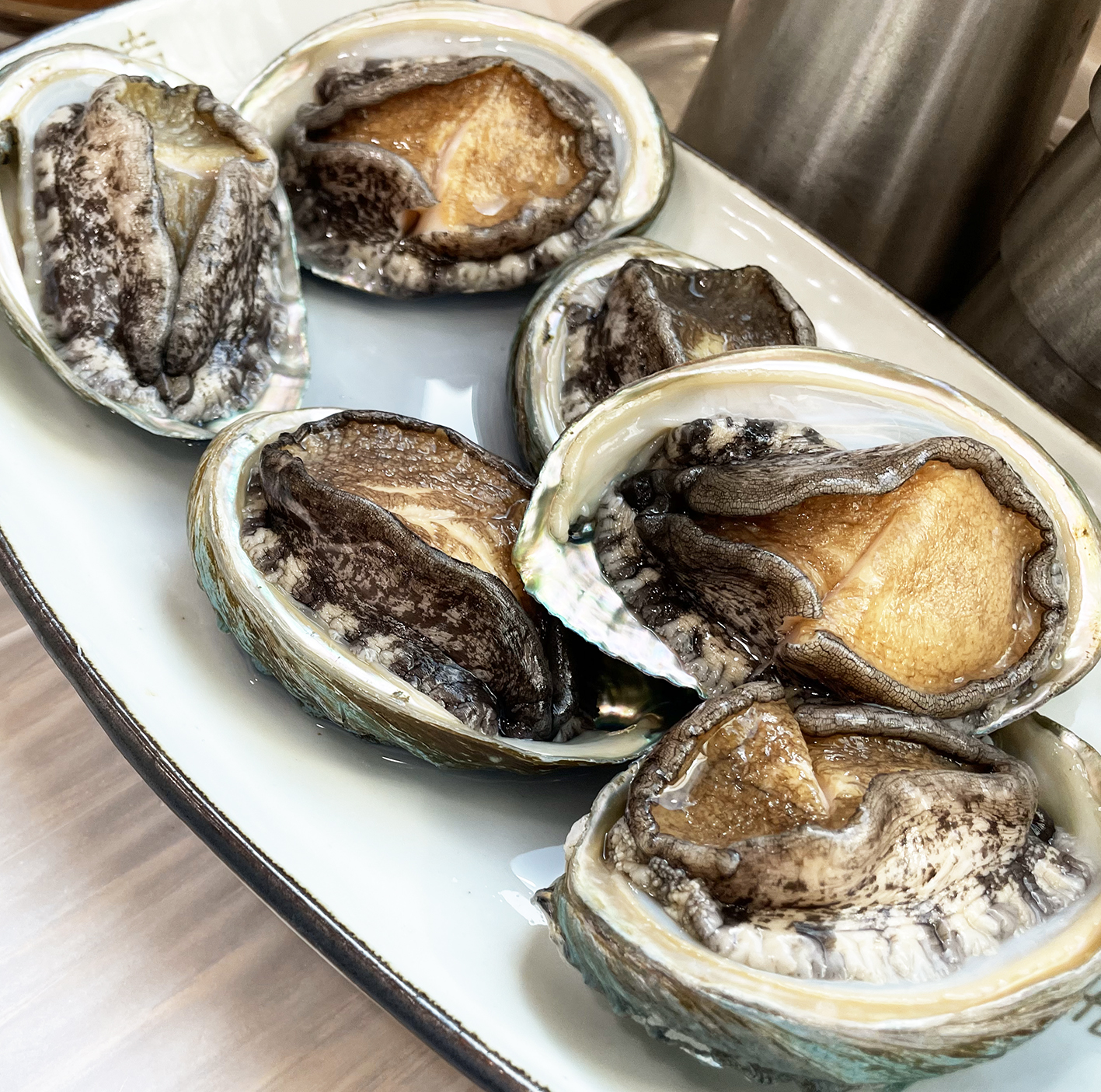 먼저 배추와 채소를 듬뿍 넣어주고요. 바글 바글 끓게 되면 돼지고기와 전복을 넣어주는데요. 전복이 꿈틀꿈틀 살아 움직이더라고요. 우아~ 전복이 살아있는 최상의 신선도를 자랑해요. 육수에 오래 끓이면 질겨지니까 껍질에서 떨어질 정도로만 익혀 부드러운 식감을 살린 채로 소스에 콕 찍어주면 부드럽고 쫄깃한 맛이 최고!