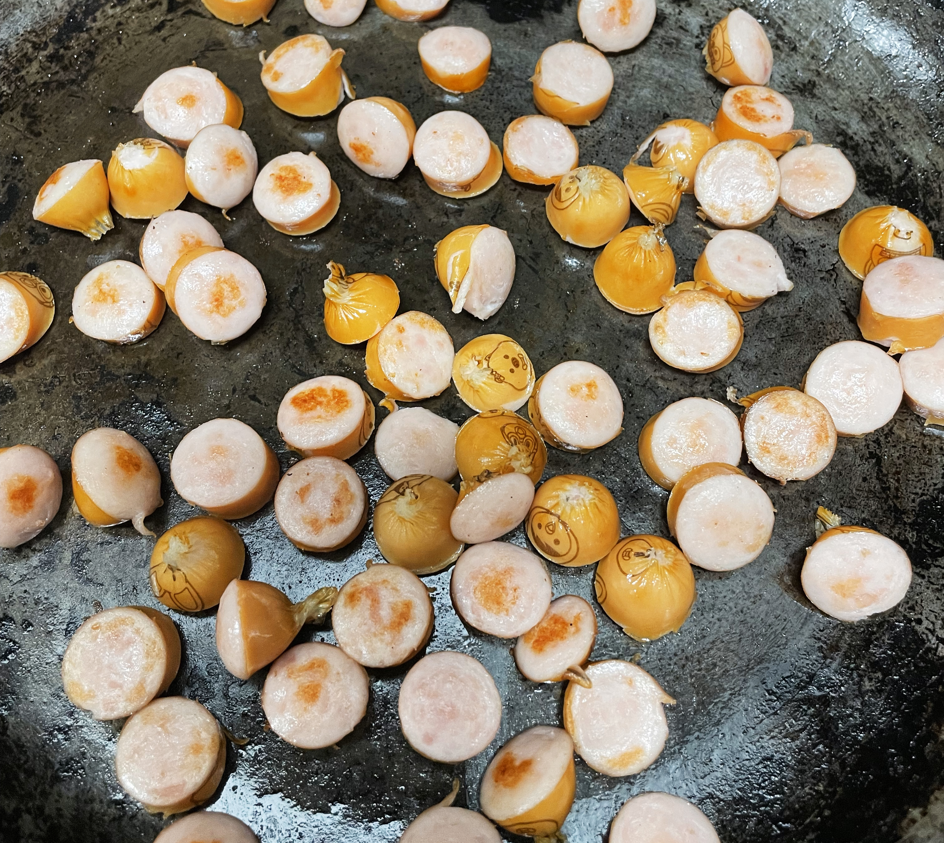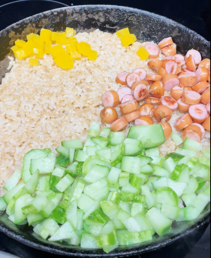 햄을 주로 쓰던데 아이들이 소시지를 더 좋아해서 소세지를 넣어요,. 프라이팬에 한번 구워서 알밥 위에 올려줄 거예요.