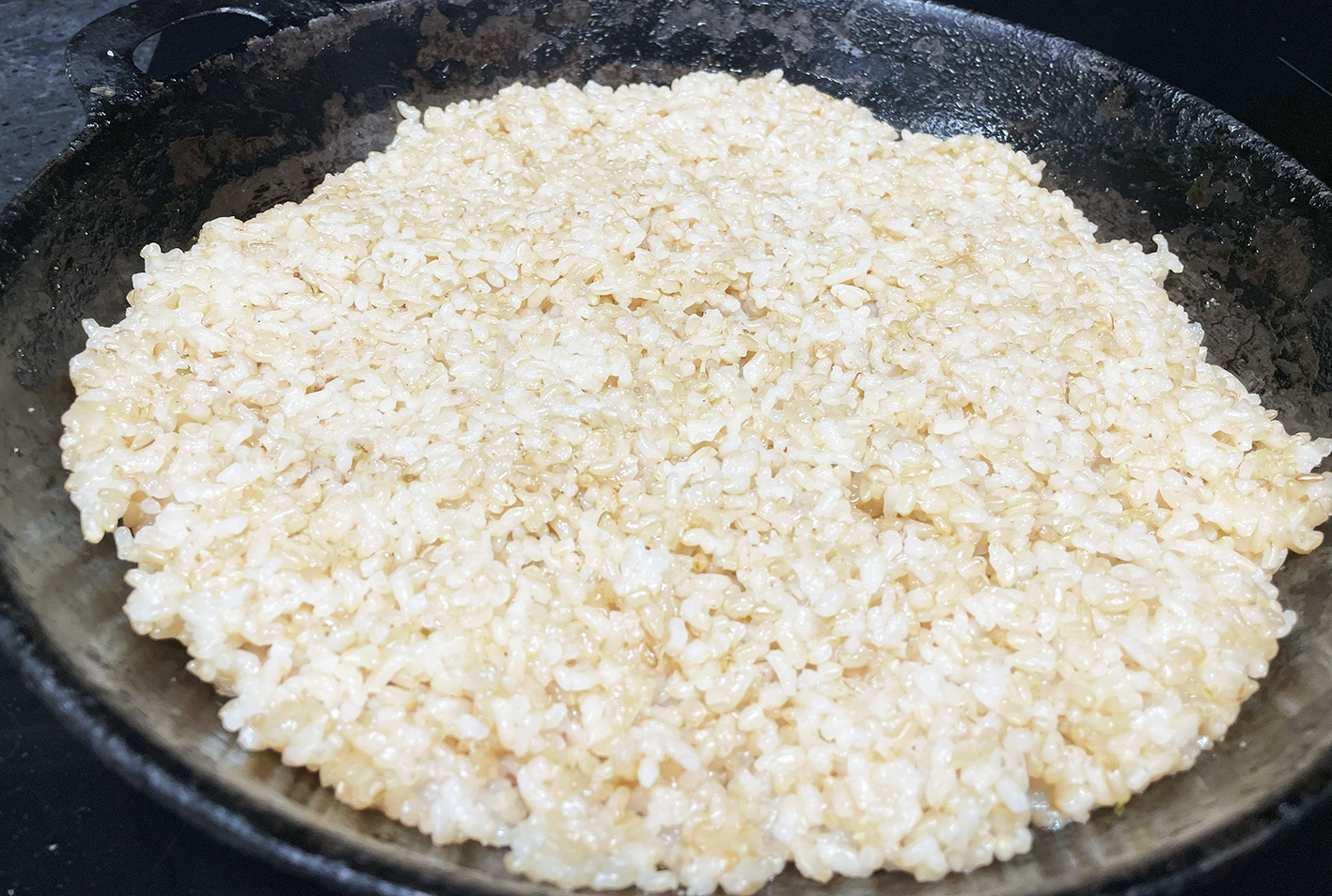 2. 무쇠팬 바닥에 밥을 골고루 펴서 누룽지가 만들어지도록 은근하게 눌러줘요. 누룽지가 만들어지면 고소하고 바삭한 맛이 더해져서 날치알과 함께 씹히는 맛이 더 재밌고 맛있게 느껴지더라고요.
