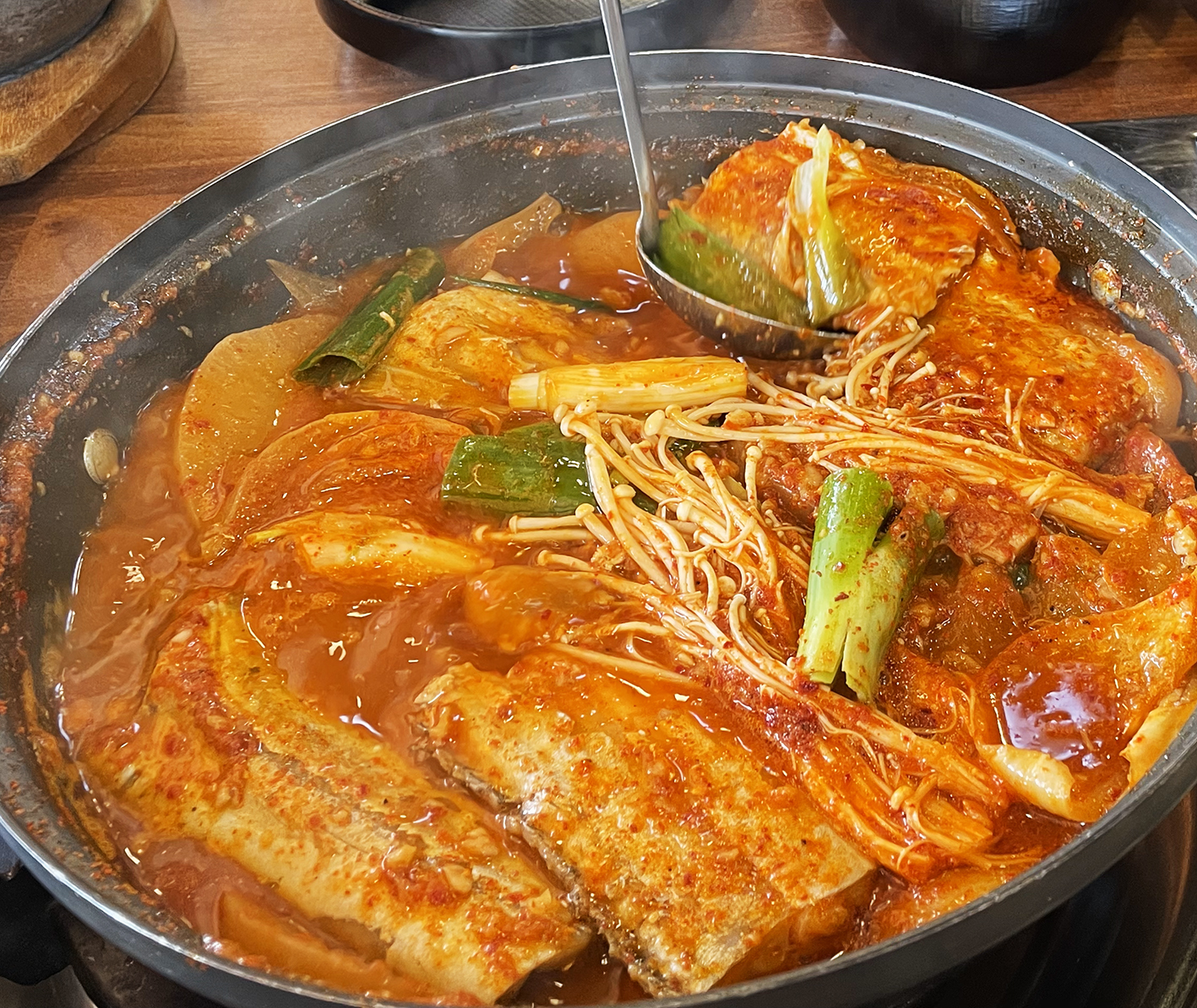 끓여가며 먹으라고 하셨는데 거의 조리가 다 돼서 나와 살짝만 끓여주고 바로 먹을 수 있어요. 매콤하고 칼칼하고 달큼한 양념이 맛있네요. 무가 맛있어서 앞에 앉은 지인은 무조림에 밥을 어찌나 맛있게 비벼 먹는지... 그만큼 양념과 무도 맛있게 익혀 함께 곁들이기 좋고요. 갈치도 크기 적당하고 살이 적당히 있어서 부드럽게 먹을 수 있어 좋고요. 양도 적당했어요.