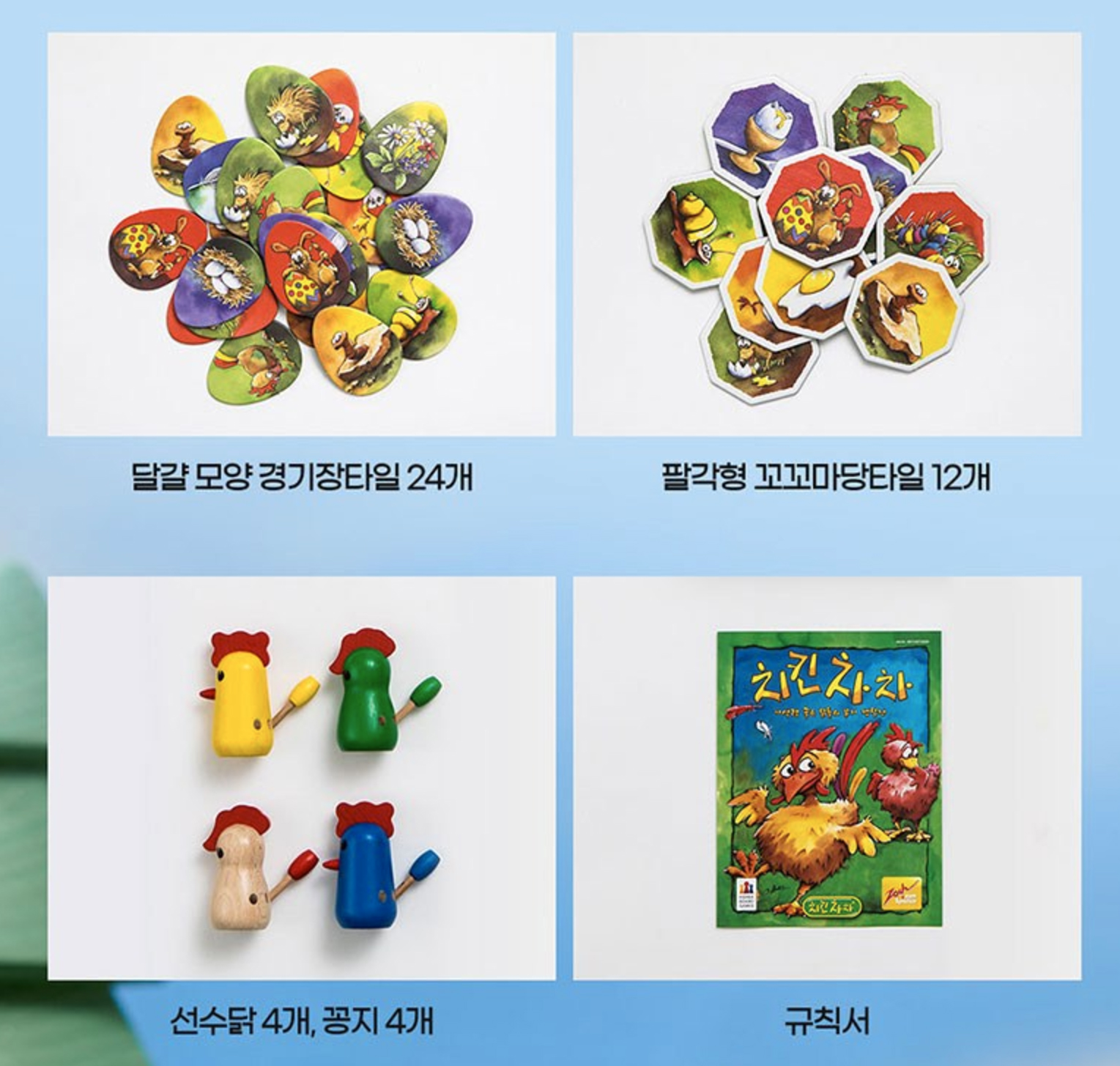 달걀 모양 경기장타일 24개 / 팔각형 꼬꼬마타일 12개 / 선수닭4개, 꽁지 4개 / 규칙서