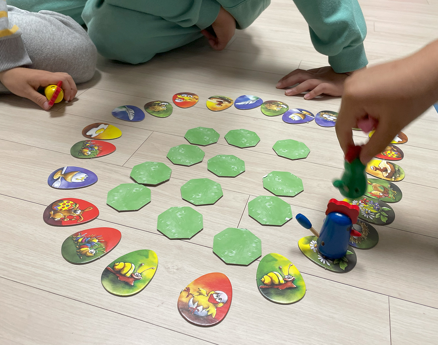 자신의 차례가 되면, 팔각 타일 1개를 뒤집고 닭 앞에 그림과 일치하면 한 칸 앞으로 전진합니다.