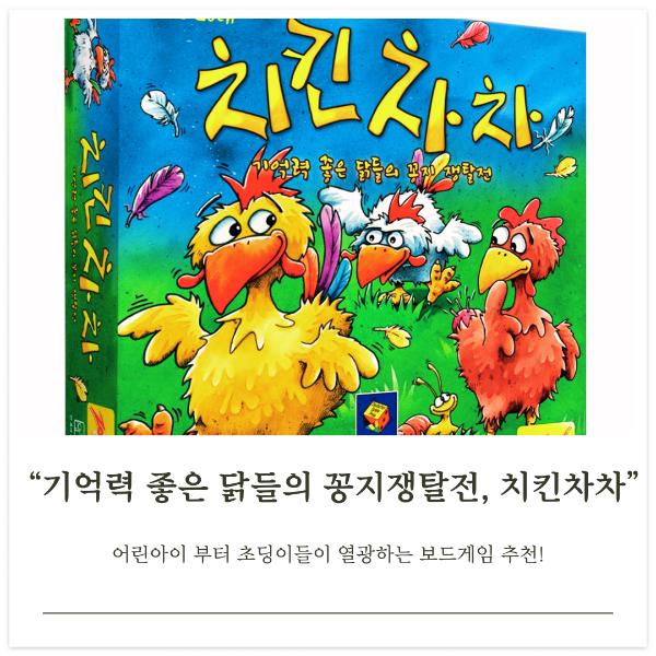특별한 인연으로 알게 된 보드게임인데 아이들이 무척 재미있어하고 집중력과 기억력을 키워줄 수 있는 메모리 게임이에요. '치킨차차'라는 이름대로 치킨이 나오는데 어찌나 유쾌하고 귀엽게 생겼는지... 그림만 딱 봐도 하고 싶은 욕구가 막 차오르지 않나요?!