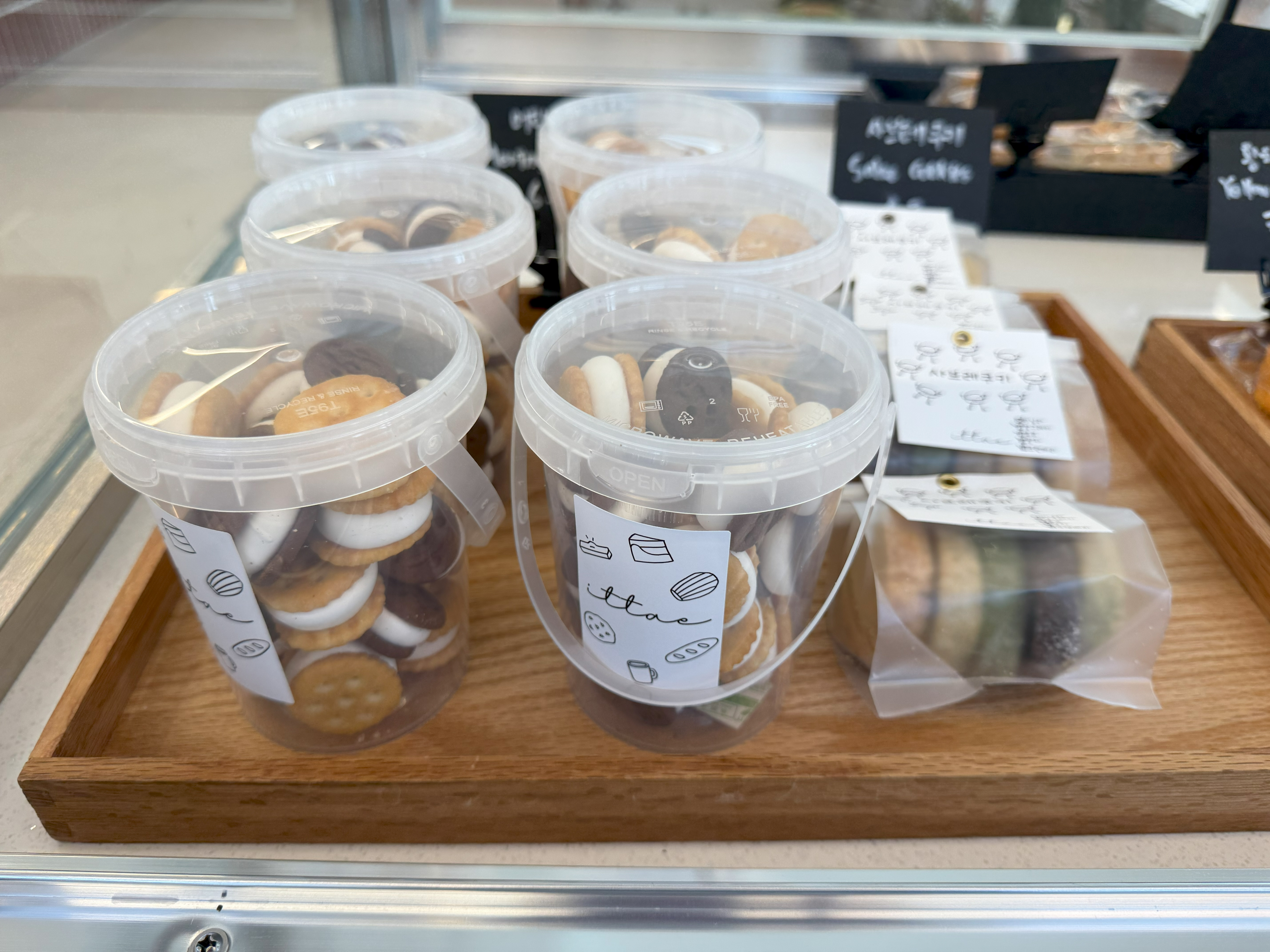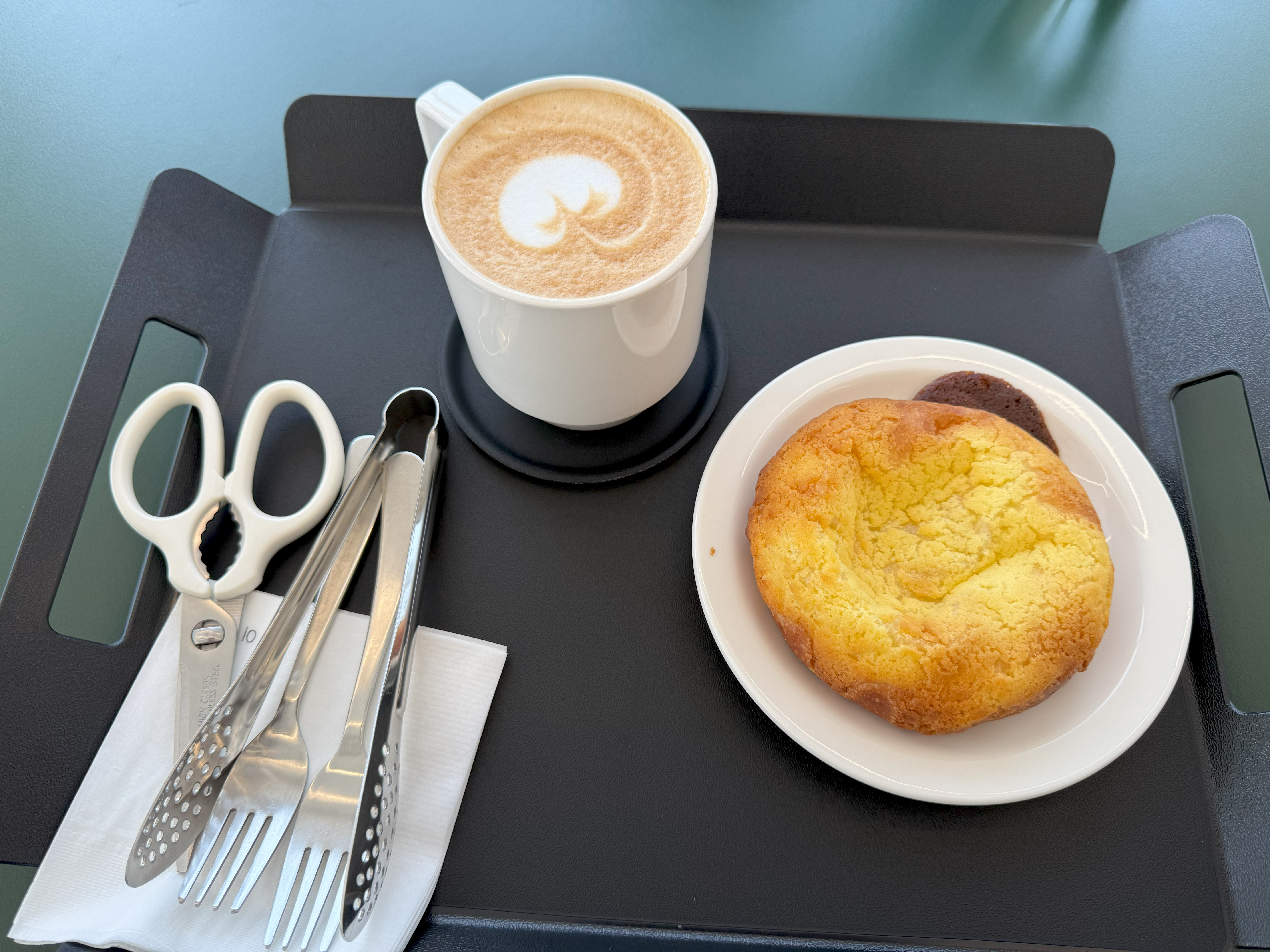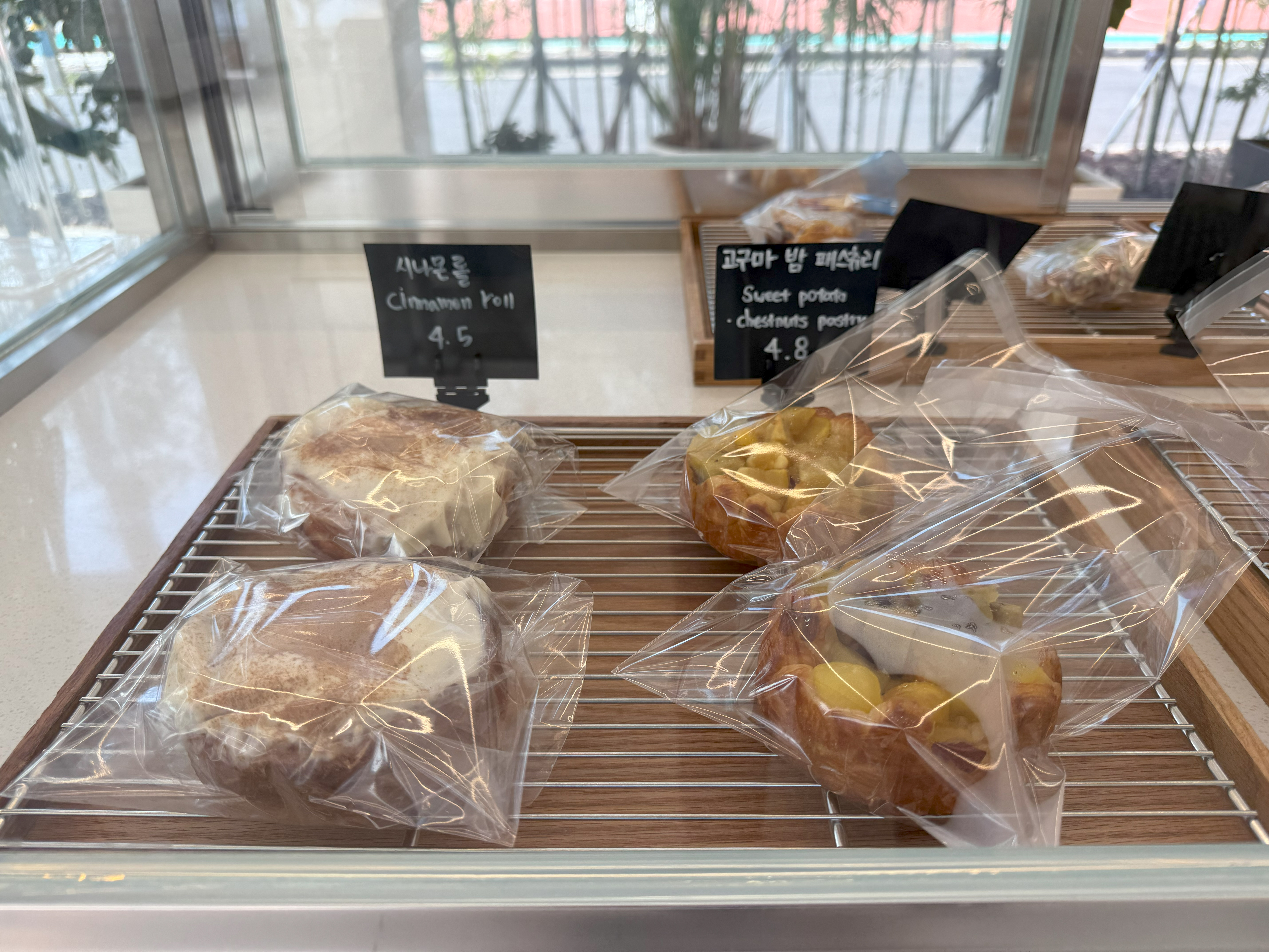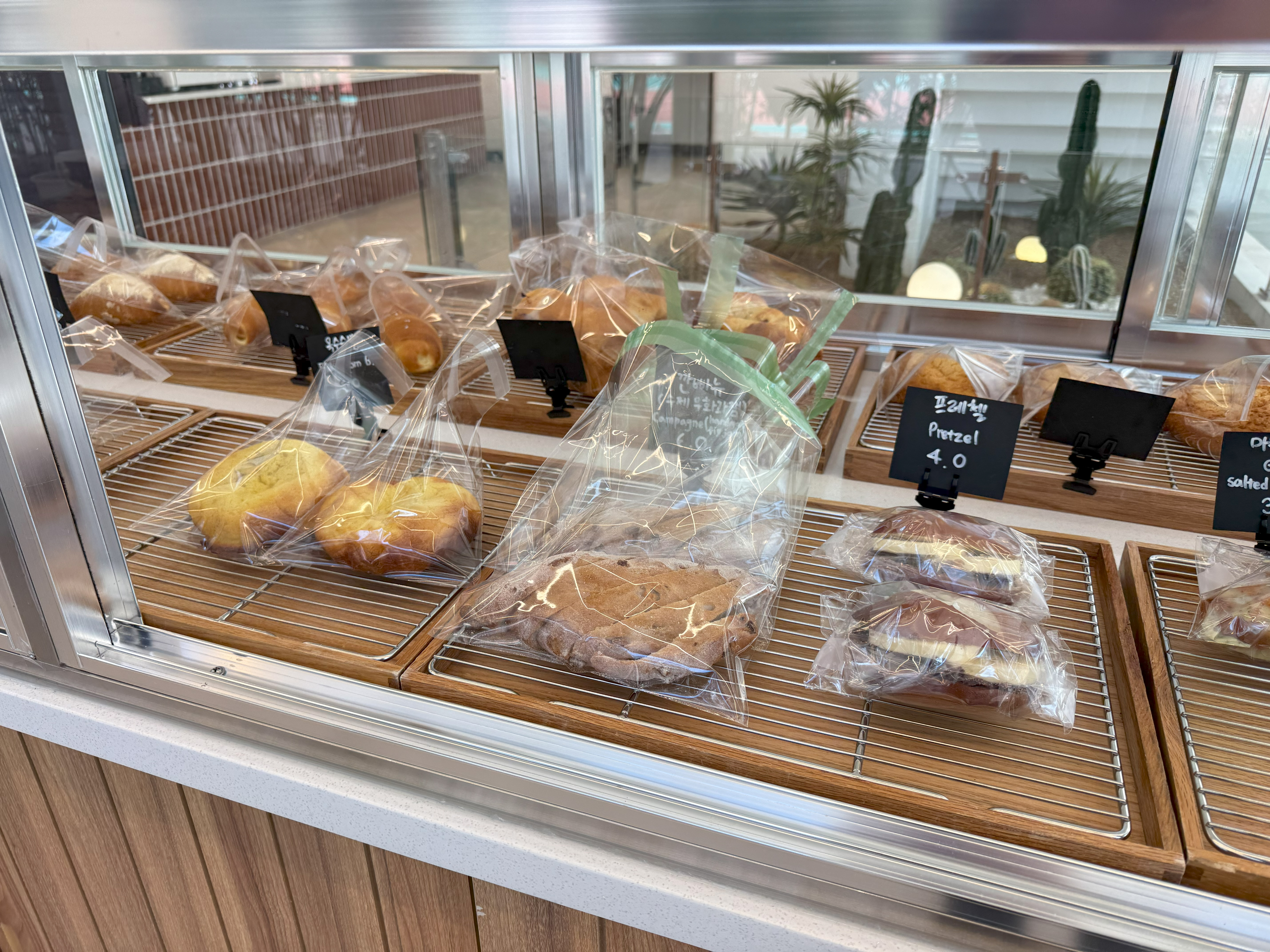케이크, 쿠키, 빵류 등 다양한데 소금빵, 에그타르트, 옥수수빵 등 다양해요. 뭘 고를까 행복한 고민을 하다 고른 옥수수빵. 따뜻한 기운을 전해줄 카페라테 주문.