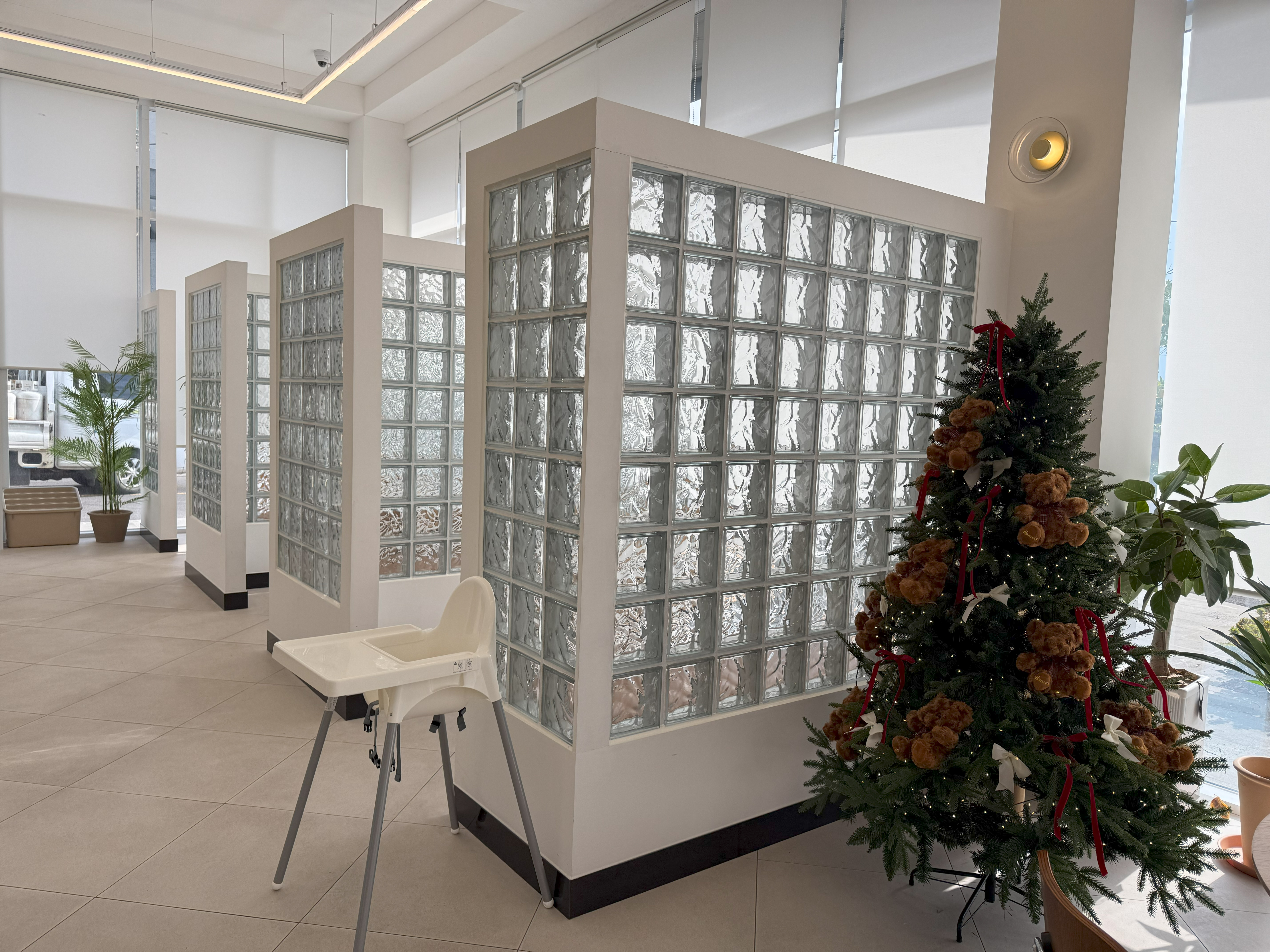 1층 크리스마스트리에서 크리스마스 분위기를 느낄 수 있네요. 유리로 공간 분리가 되어 있어요. 프라이빗하게 즐길 수 있겠어요. 아기 의자 보이죠? 여긴 예스키즈존.