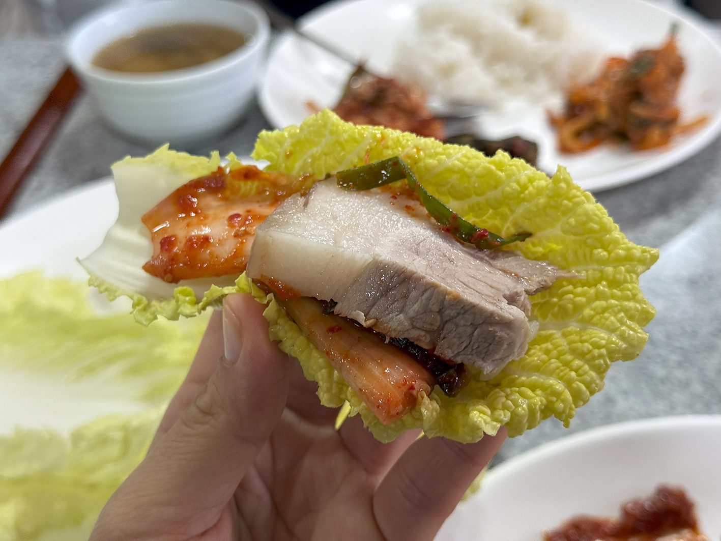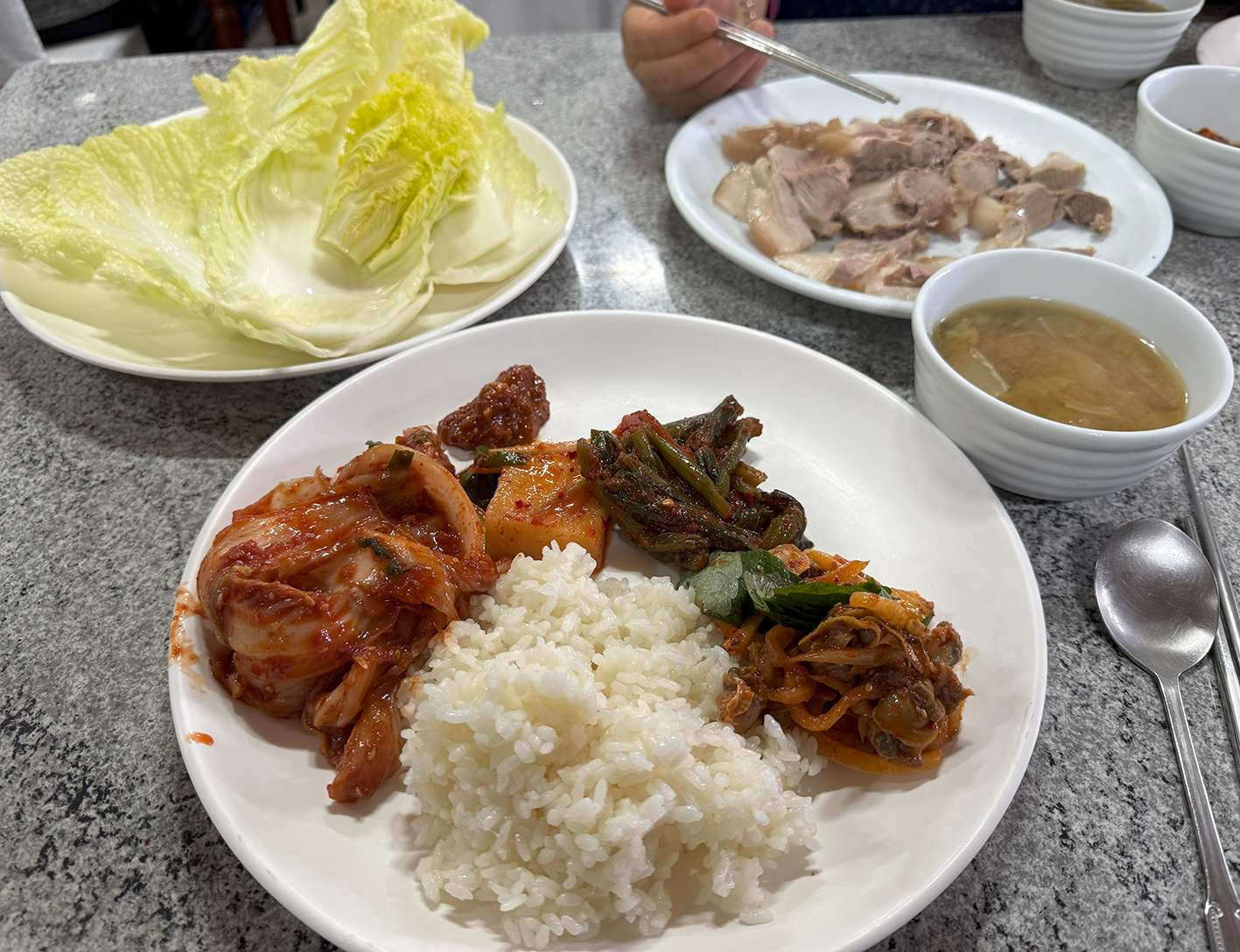 뷔페 스타일로 원하는 양 접시에 가득 담아요. 싱싱하고 아삭아삭 배춧잎에 김장김치, 수육 척 올려 한입에 쏙! 엄지가 모라자 손가락 열개 다 올라갈 맛!