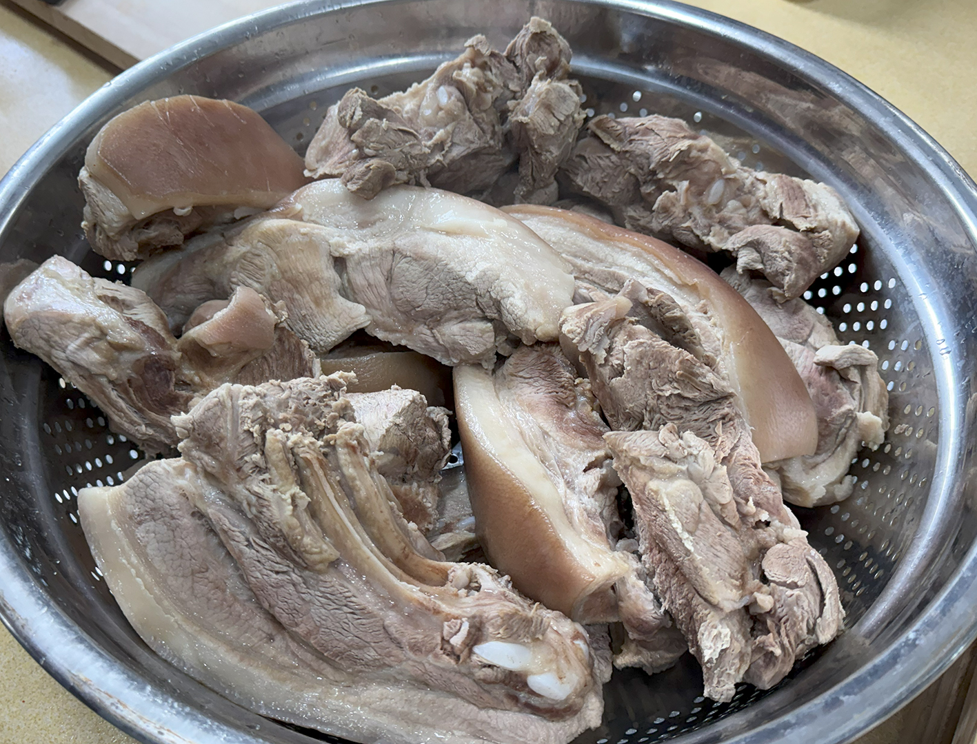 뽀얀 김을 내뿜는 제주도 스타일 수육. 부드럽게 삶아진 삼겹살 수육을 제주도 스타일로 투박하게 썰어주셔서 접시에 한가득.