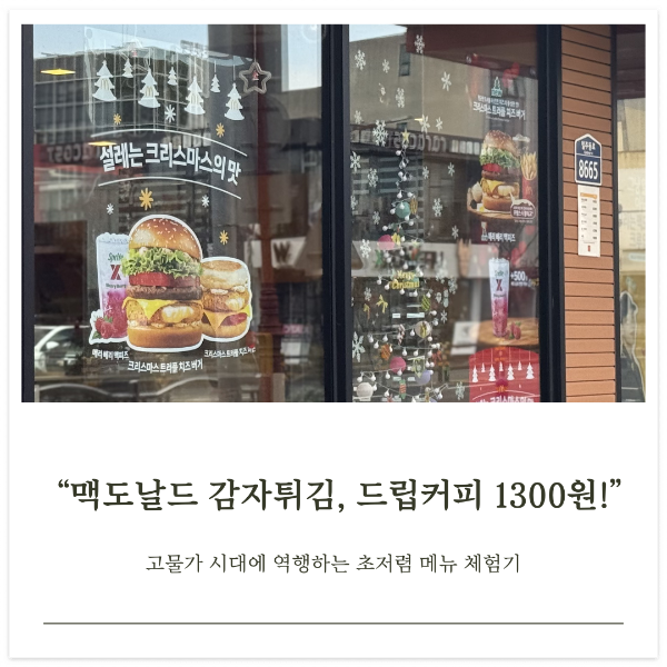크리스마스로 화려하게 단장된 서귀포 맥도날드. 추운 날씨 속 따뜻하고 아늑한 장소로, 맛있는 감자튀김과 향긋한 드립커피의 조화가 잘 어우러 졌고요. 고물가 시대에 1300원으로 즐길 수 있는 감자튀김과 커피는 그야말로 가성비 최고!