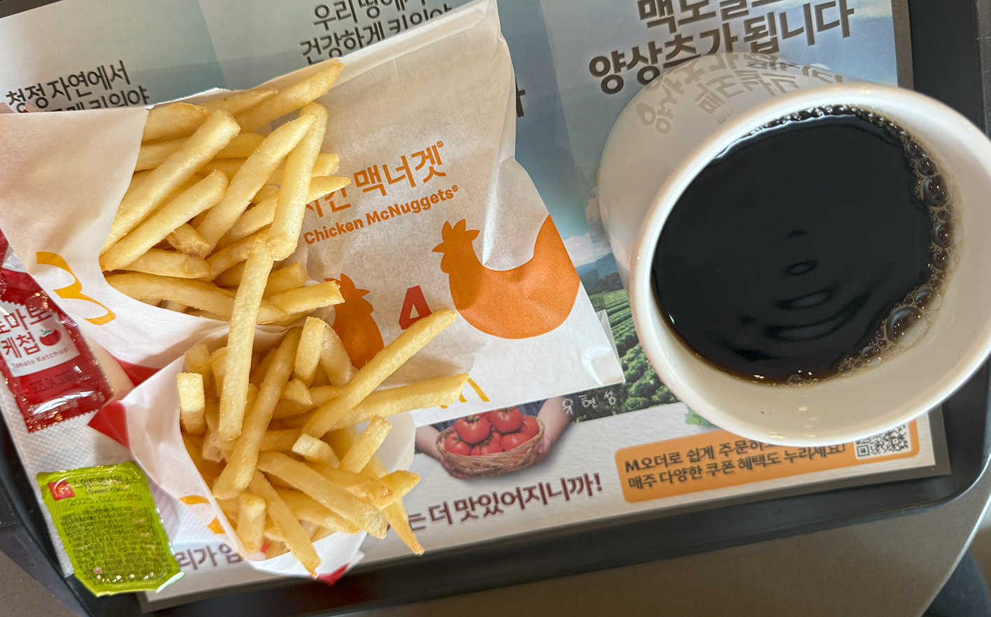갓 튀겨져 바삭하고 짭조름한 감자튀김은 기대 이상. 아라비카 원두로 만들어진 드립커피는 추운 몸을 따뜻하게 녹여줬어요. 이런 메뉴를 편안한 공간에서 합리적인 가격에 즐길 수 있다는 점은 맥도날드만의 큰 장점이 아닐까 싶어요.